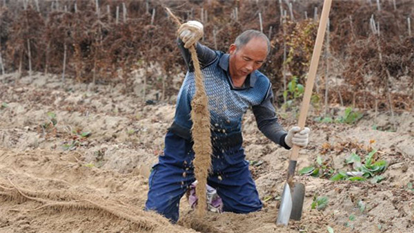 種植一畝山藥成本大約在6000~7000元,人工挖掘山藥一個人一天可以挖150米,挖山藥的工錢依照挖的地段長度結算,一米是一塊三,一天挖一百五十米的收入在200塊錢左右。15個人一天就是3000元。